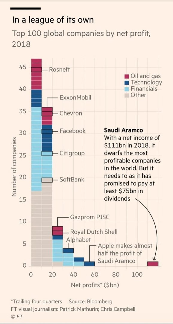 Готовящаяся к IPO Saudi Aramco станет c большим отрывом крупнейшим публичным бизнесом по прибыли в мире. Apple едва дотягивает до половины от показателя в $111 млрд саудовского нефтедобывающего гиганта в 2018 году.