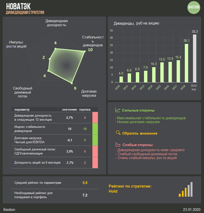 Согласно текущей дивидендной политике компании, "Новатэк" направляет на дивиденды не менее 30% скорректированной чистой прибыли по МСФО. Мы полагаем, что компания захочет поддержать итоговые дивиденды на уровне не ниже предыдущего года и увеличит коэффициент уже в ближайшей перспективе.