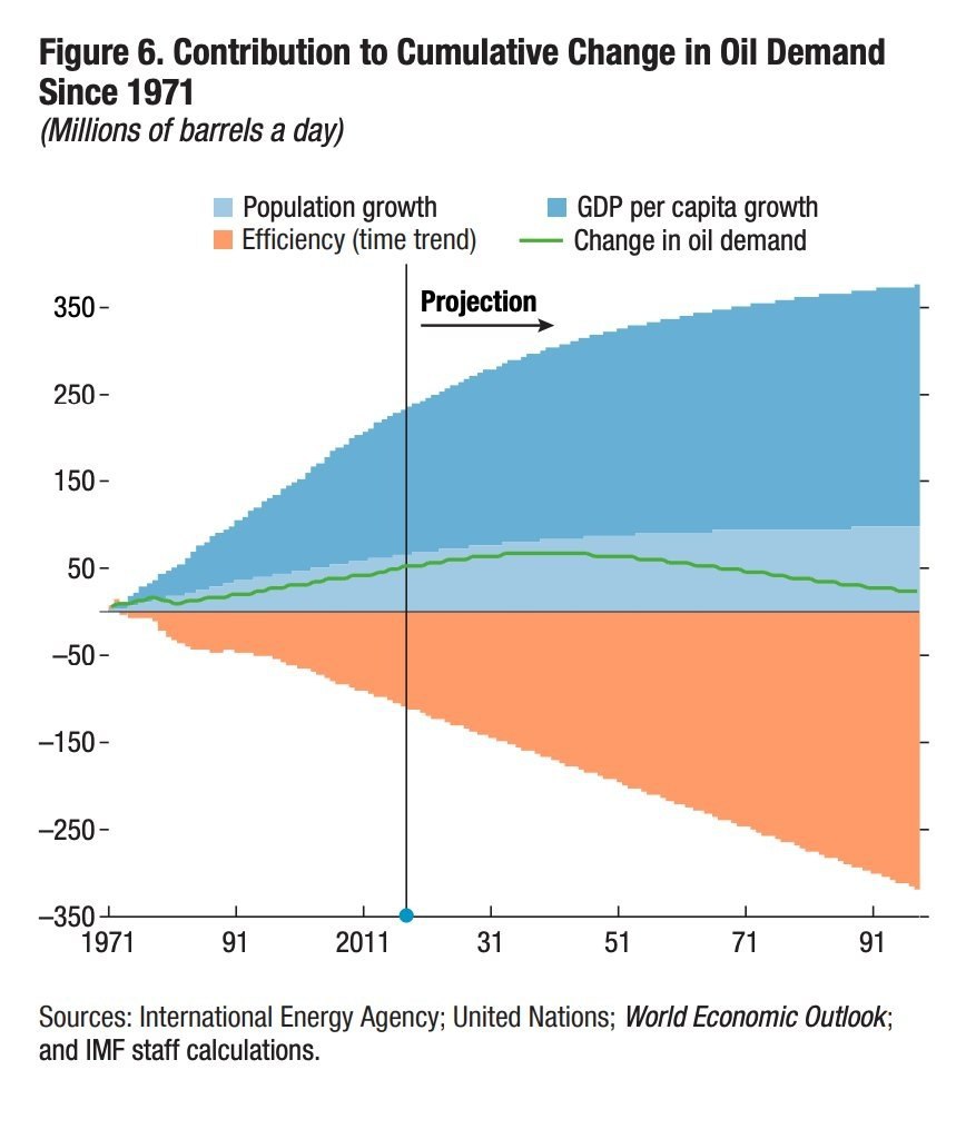 В этом исследовании МВФ прогнозируется, что к 2040 году вклад эффективности превысит вклад от роста населения и ВВП. Мировой спрос на нефть стабилизируется на уровне 115 млн барр в сутки и начнет снижение. Сейчас он составляет около 100 млн барр в сутки.