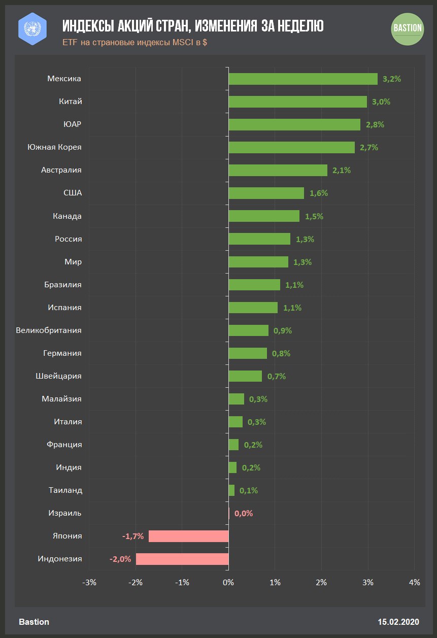 🇨🇳 Китай +3%: индекс страны продолжает восстанавливаться после вирусной паники, прибавляя в стоимости вторую неделю подряд. На этой неделе о росте выручки на 40% и прибыли на 50% в 4 квартале 2019 года отчитался крупнейший представитель индекса (17%) интернет-ритейлер Alibaba.