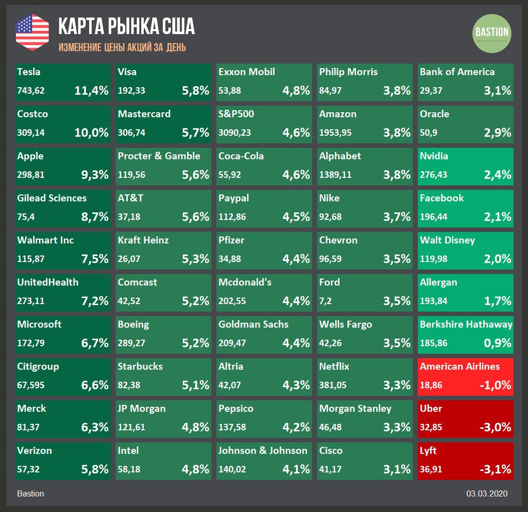 Американский рынок в понедельник показал рост на 4,6%. Все 11 секторов индекса S&P500 выросли минимум на 2%.