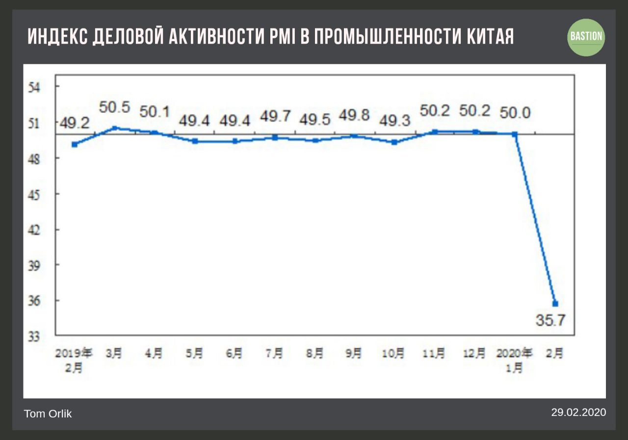 Стоимость нефти Brent упала ниже $49 за баррель впервые за 2,5 года. Из-за вспышки коронавируса цена за два месяца опустилась на 24%.