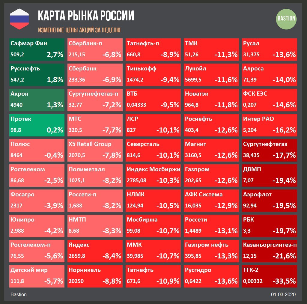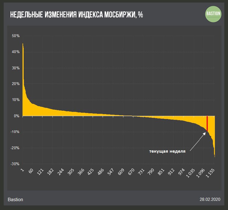 📉 Индекс Мосбиржи -10,3% за неделю. Это 37 место среди среди худших недель в истории российского рынка. Прибавить в цене удалось лишь нескольким акциям. Если устойчивость производителя лекарств Протек еще можно объяснить, то о компаниях Михаила Гуцириева (Сафмар, Русснефть) и Акроне рынок похоже просто забыл.
