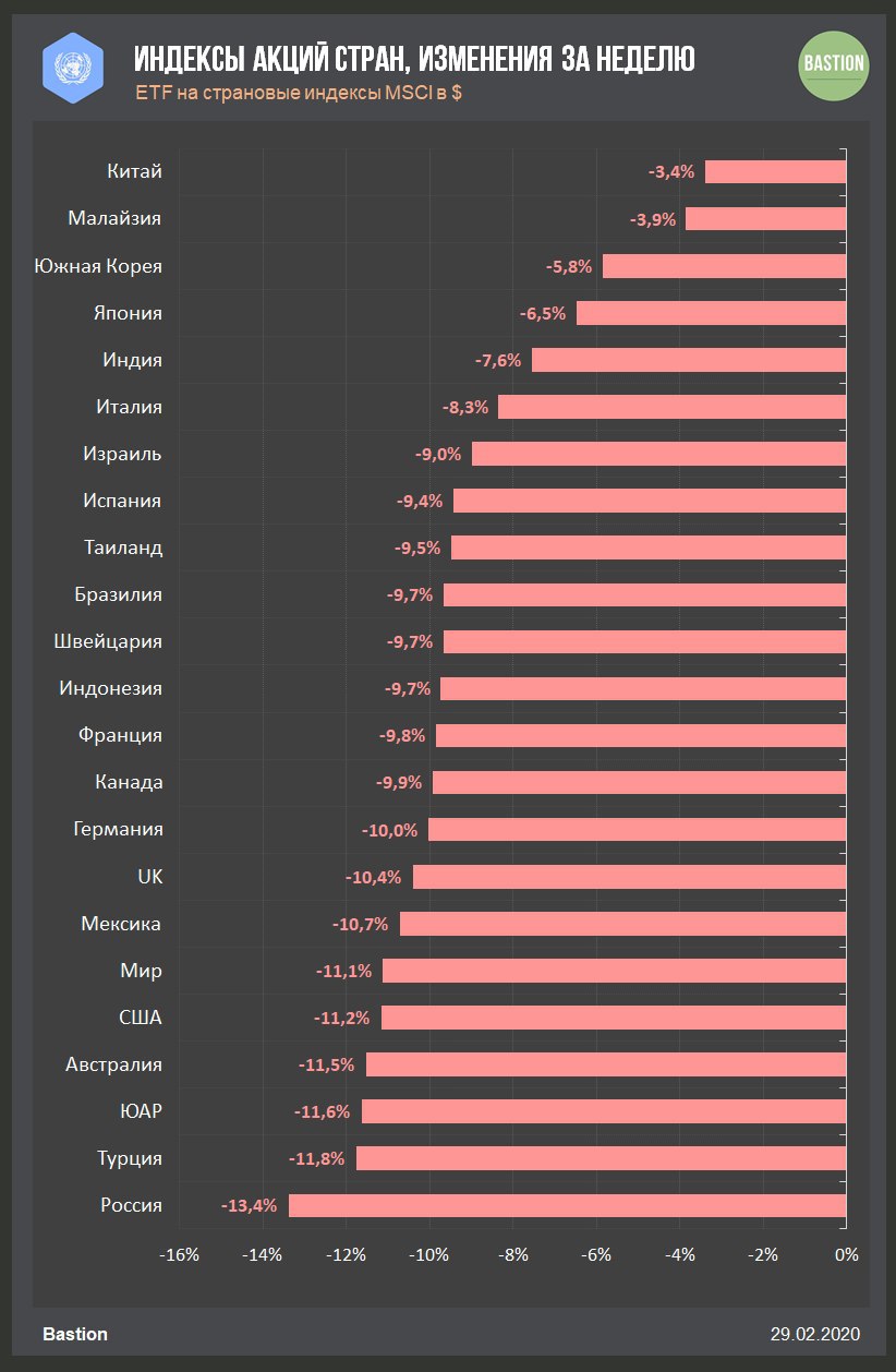 🇨🇳 Китай -3,4%. Страхи перед эпидемией обвалили акции по всему миру на этой неделе, при этом китайский рынок оказался наиболее устойчивым к панике.