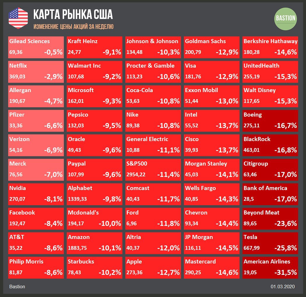 💊 Gilead Sciences. Фармацевтическая компания начинает тестирование антивирусного препарата "ремдисивир" на 1000 пациентах в медицинских лабораториях по всему миру. NY Times пишет, что первые результаты работы экспериментального препарата в китайском Ухане появятся в апреле. Акции Gilead Sciences значительно лучше рынка, -0,5% за неделю.