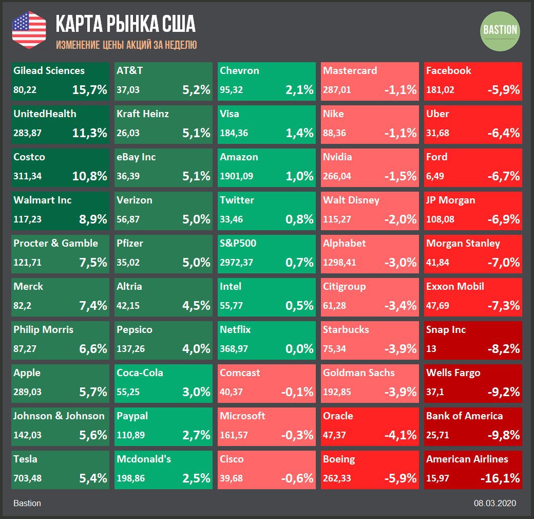 💊 Gilead Sciences +15,7%. Как и неделю назад, фармацевтическая компания среди лучших по доходности. Многие ждут, что уже в течение нескольких месяцев Gilead сможет начать продажи лекарства от коронавируса.