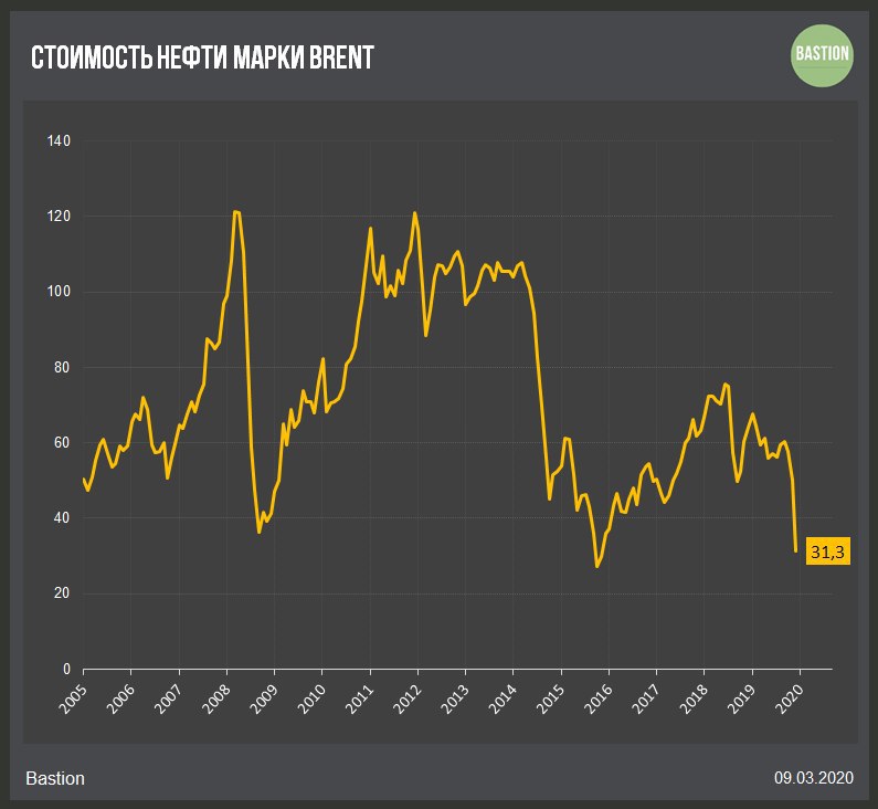 ▫️Баррель Brent снижался утром до $31,3, минимум с января 2016 года, когда цена опускалась до $27.