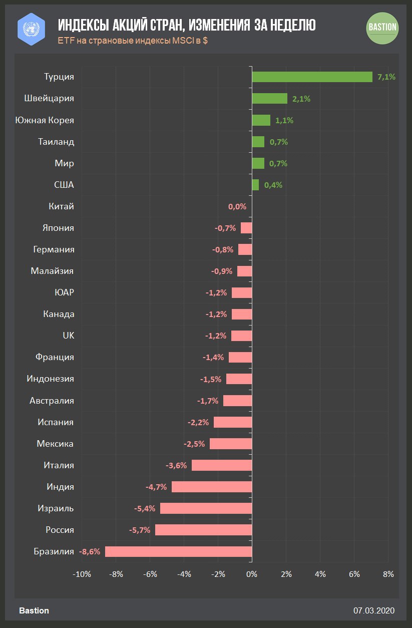 🇹🇷Турция +7,1% за счет укрепления курса лиры. Турецкая валюта позитивнее других отреагировала на снижение ставки в США.