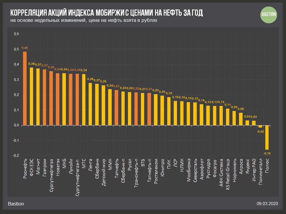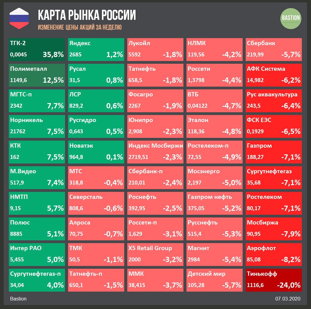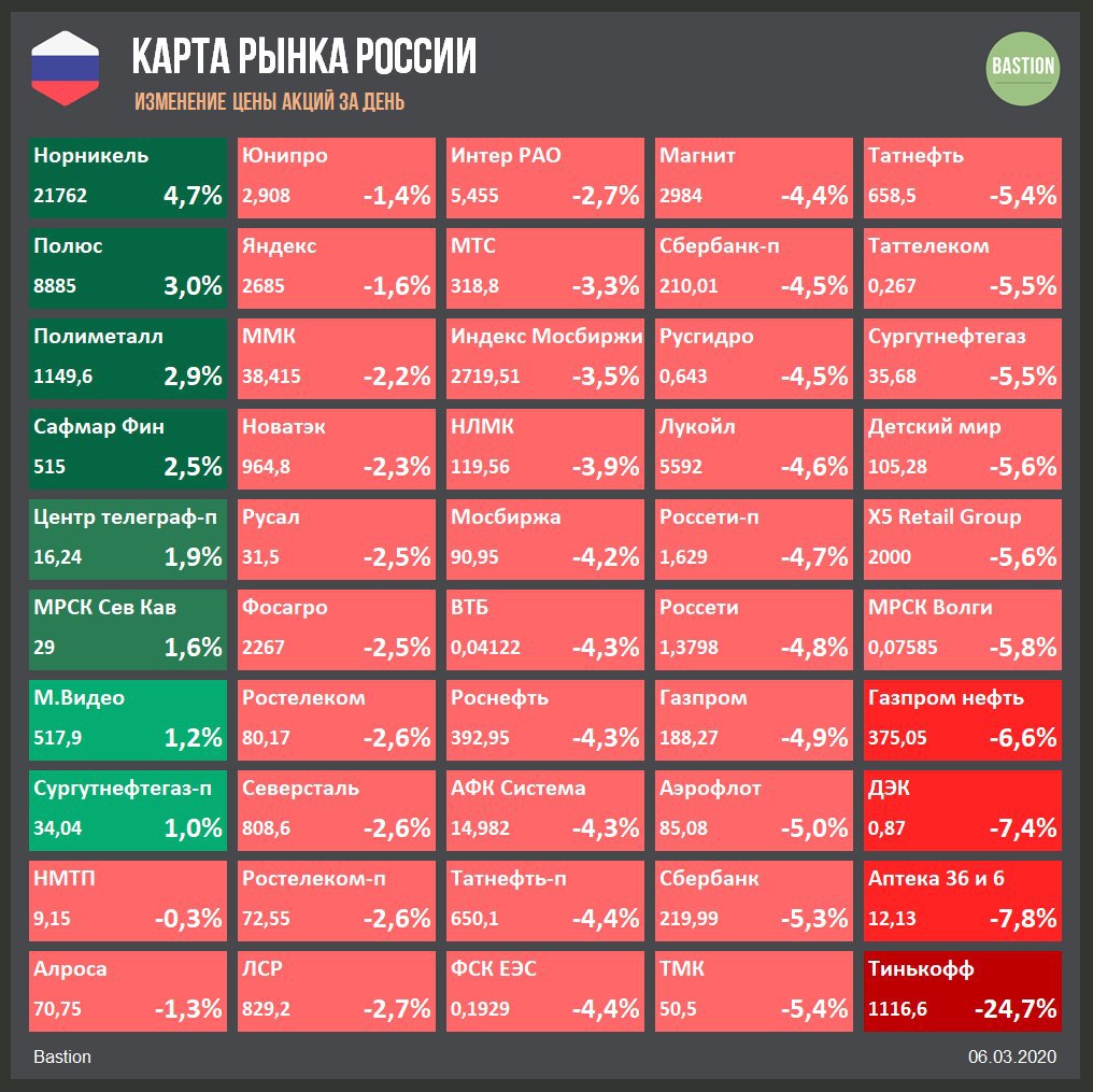 🛢Россия пока не согласилась с рекомендацией комитета ОПЕК+ сократить добычу нефти из-за коронавируса. Цена на нефть марки Brent упала на 9% до $45. Российская нефтянка хуже рынка: Татнефть -5,4%, Сургутнефтегаз -5,5%, Газпром нефть -6,6%