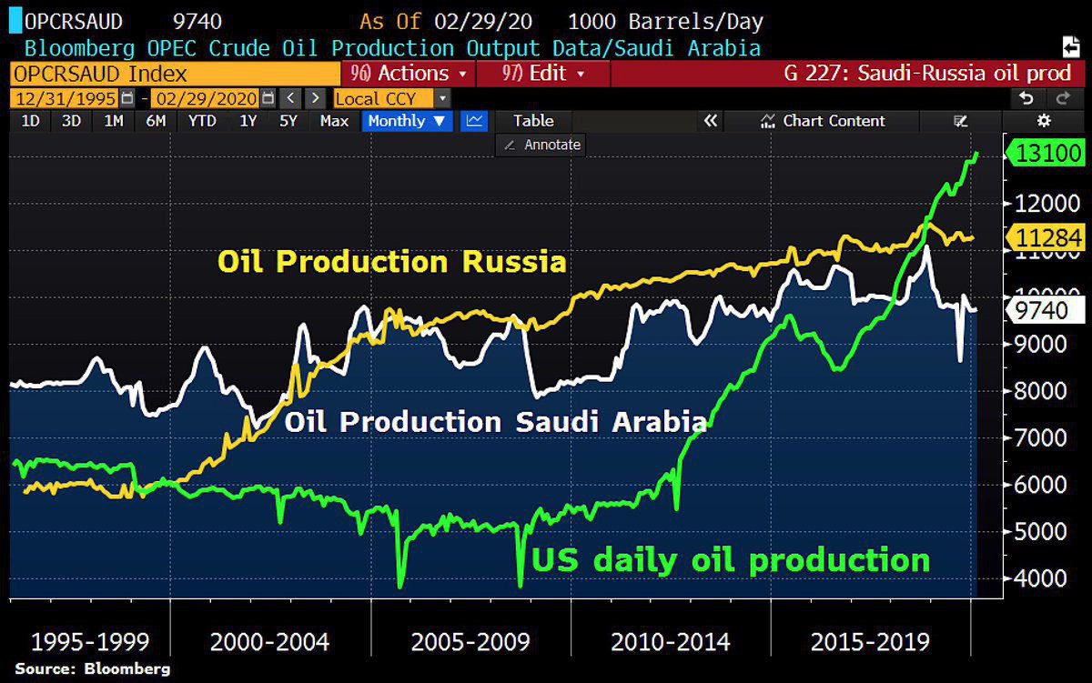 "Разногласия между Саудовской Аравией и Россией начались в начале февраля, когда наследный принц Мухаммед попросил своего папу, короля Салмана, позвонить Путину и потребовать нового сокращения добычи.