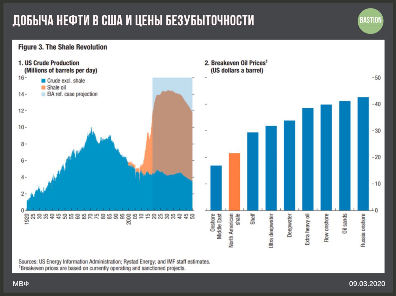 На этот вопрос нет единого ответа. Например, МВФ в недавнем исследовании оценивал цену безубыточности в $20. Однако подход, судя по всему, учитывает издержки для работы уже запущенных месторождений. Если оценивать инвестиции в новые месторождения, то уровень безубыточности вырастает до $45-55 - Федеральный резервный банк Далласа.