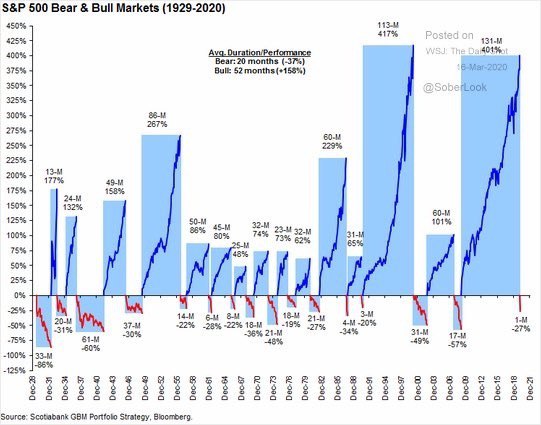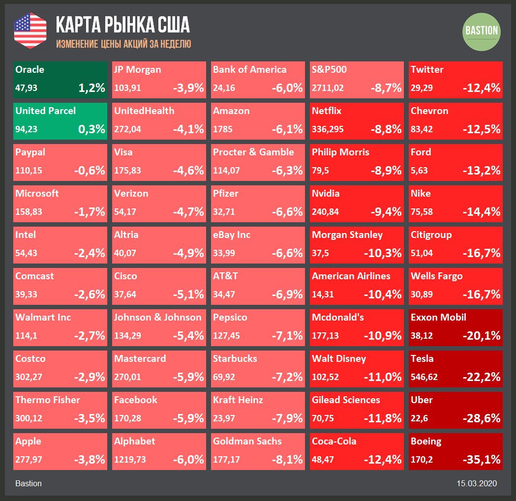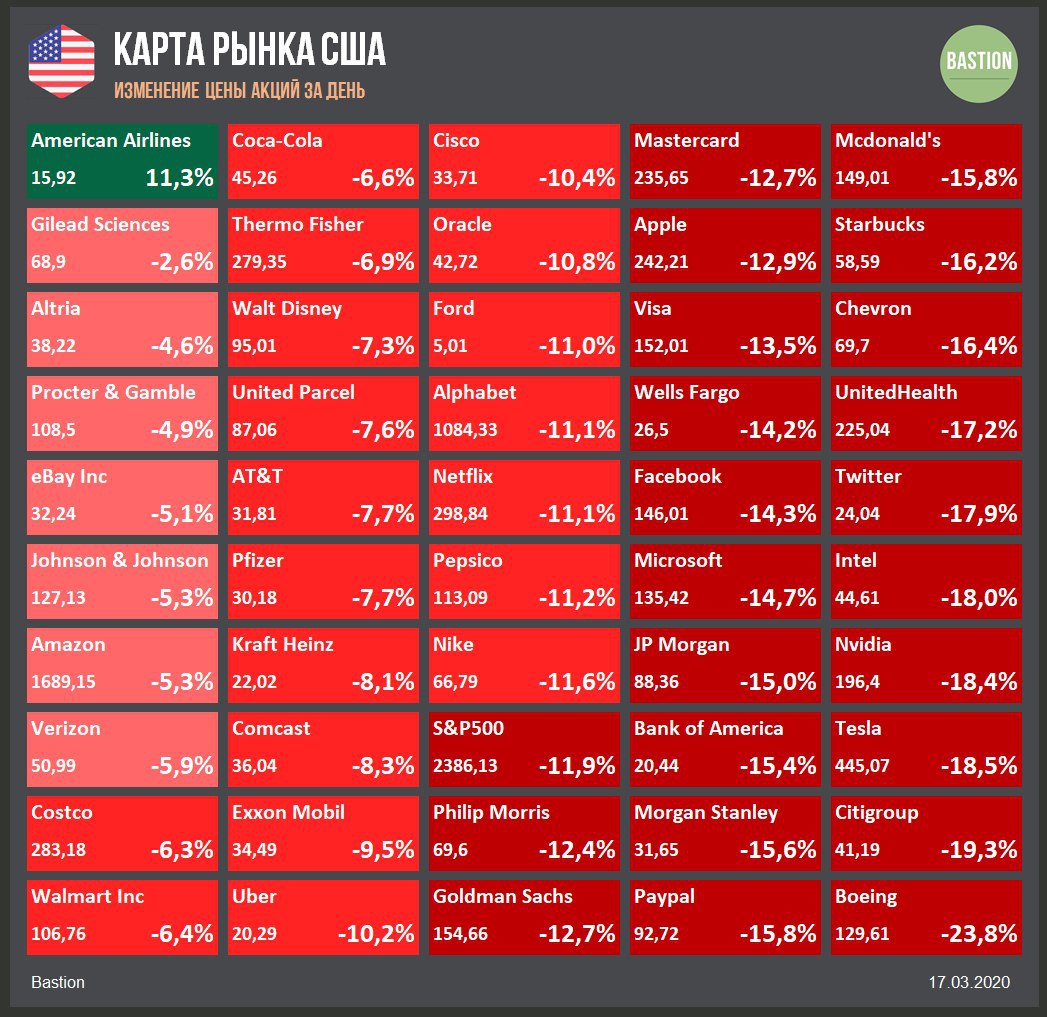 📉 Индекс S&P500 упал вчера почти на 12%, несмотря на объявленные ФРС меры монетарной поддержки. Это худший торговый день с 1987 года. Сегодня утром фьючерсы на американский рынок восстанавливаются на 2-3%, однако похоже, что паника еще не закончена.