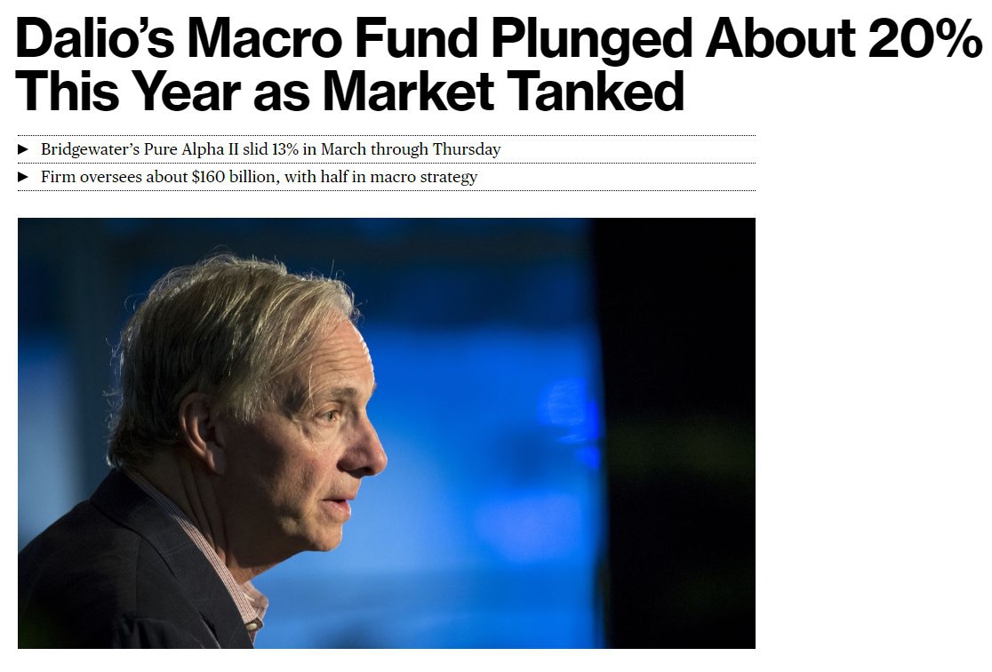 Управляющий крупнейшего хедж-фонда мира Bridgewater Рэй Далио объявил, что его знаменитый фонд Pure Alpha потерял 20% с начала года.