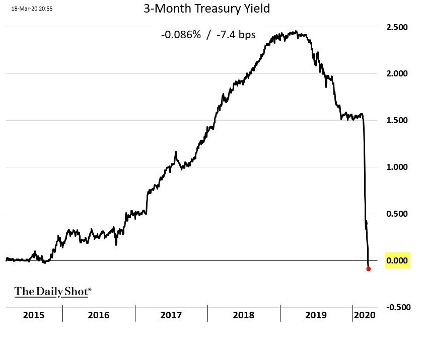 ​​💵 Ставка по 3-месячным облигациям США вчера опускалась ниже нуля. Краткосрочные американские облигации в последние дни чуть ли не единственный актив, который растет в стоимости. "Инвесторам отчаянно нужен долларовый кэш", комментирует ситуацию главный стратег по облигациям Charles Schwab.