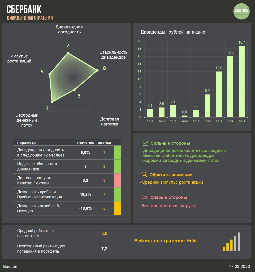 Рейтинг Сбербанка по дивидендной стратегии находится на уровне Hold. Этого недостаточно для попадания в портфель.