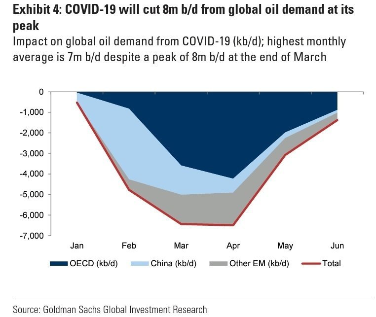 ​​🛢 Падение спроса на нефть достигнет максимума в 8 млн барр в сутки к концу марта - мнение Goldman Sachs