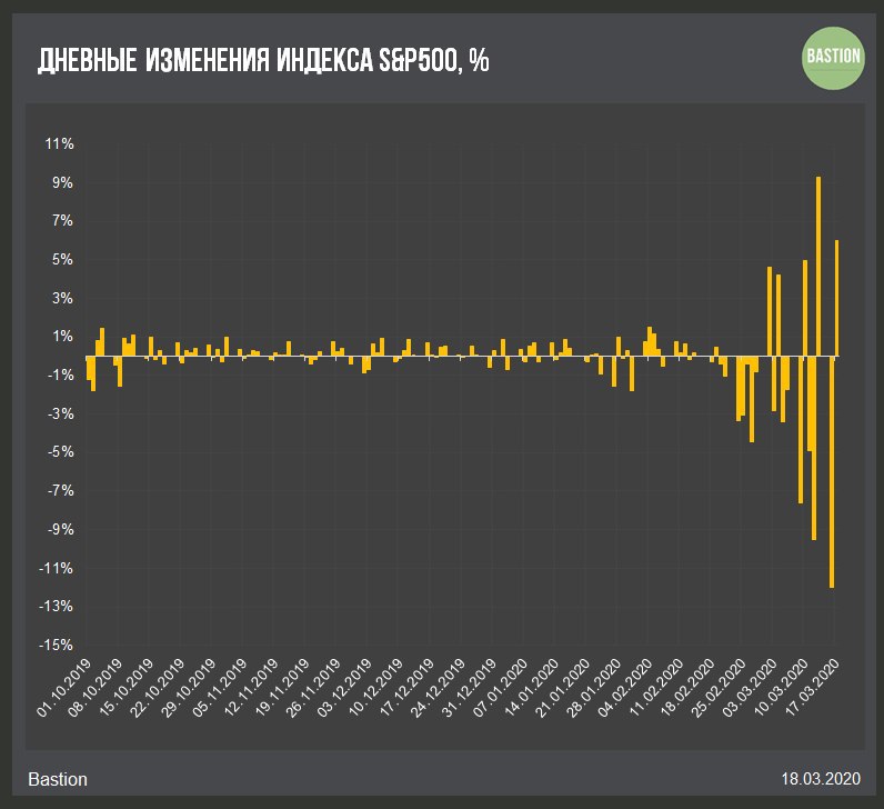 Последние 7 торговых дней индекс акций S&P500 двигается изменениями не менее чем по 4%. Такой серии в истории рынка еще не было. Колоссальная неопределенность.
