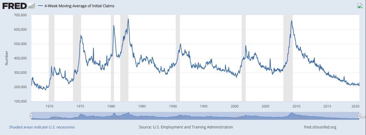 Мрачный прогноз это слабо сказано. За историю подсчета средний уровень показателя за 4 недели не превышал 700 тысяч. TS Lombard ждет, что в апреле безработица вырастет до 10,6%, что является максимумом с 1948 года. Экономика продолжает погружаться в зону неизведанного.