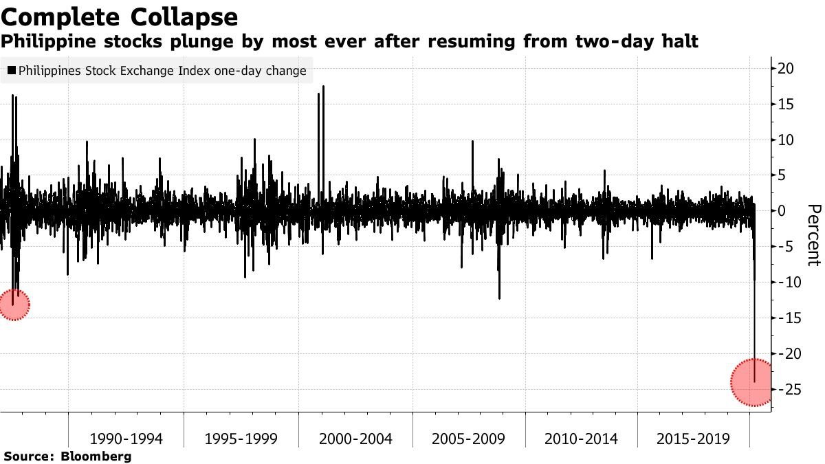 ​​🇵🇭 Позавчера торги на Филиппинской фондовой бирже были приостановлены. Сегодня после возобновления торгов местный индекс акций упал на 24%. Перехитрить панику не удалось.