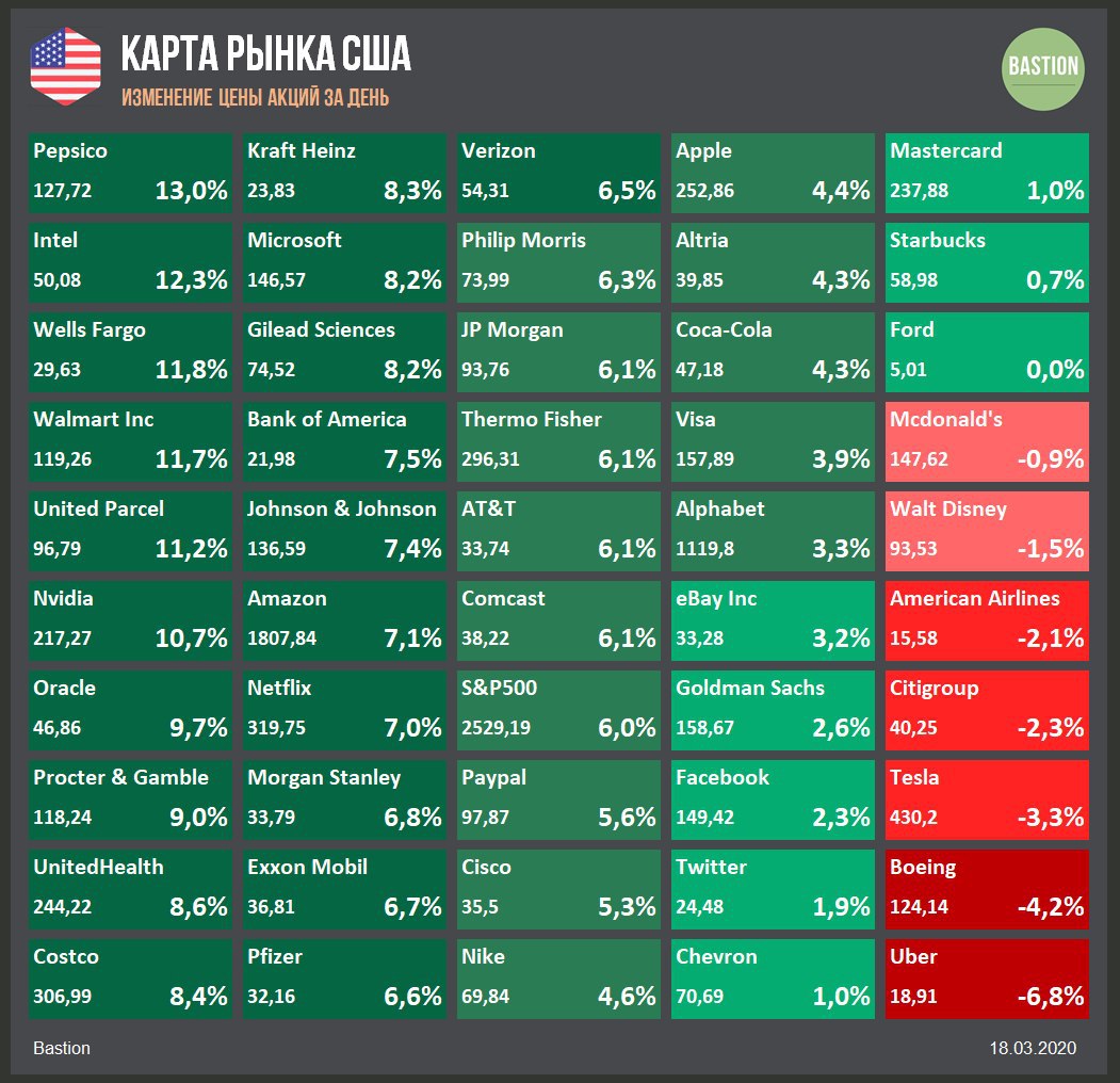 📈 Индекс акций S&P500 вырос на 6% после объявления масштабных мер поддержки экономики. Еще несколько недель назад в это невозможно было поверить, но в США запустят программу "денег с вертолета". Два транша по $250 млрд будут направлены населению напрямую. Еще более $500 млрд пойдет на поддержку бизнеса.
