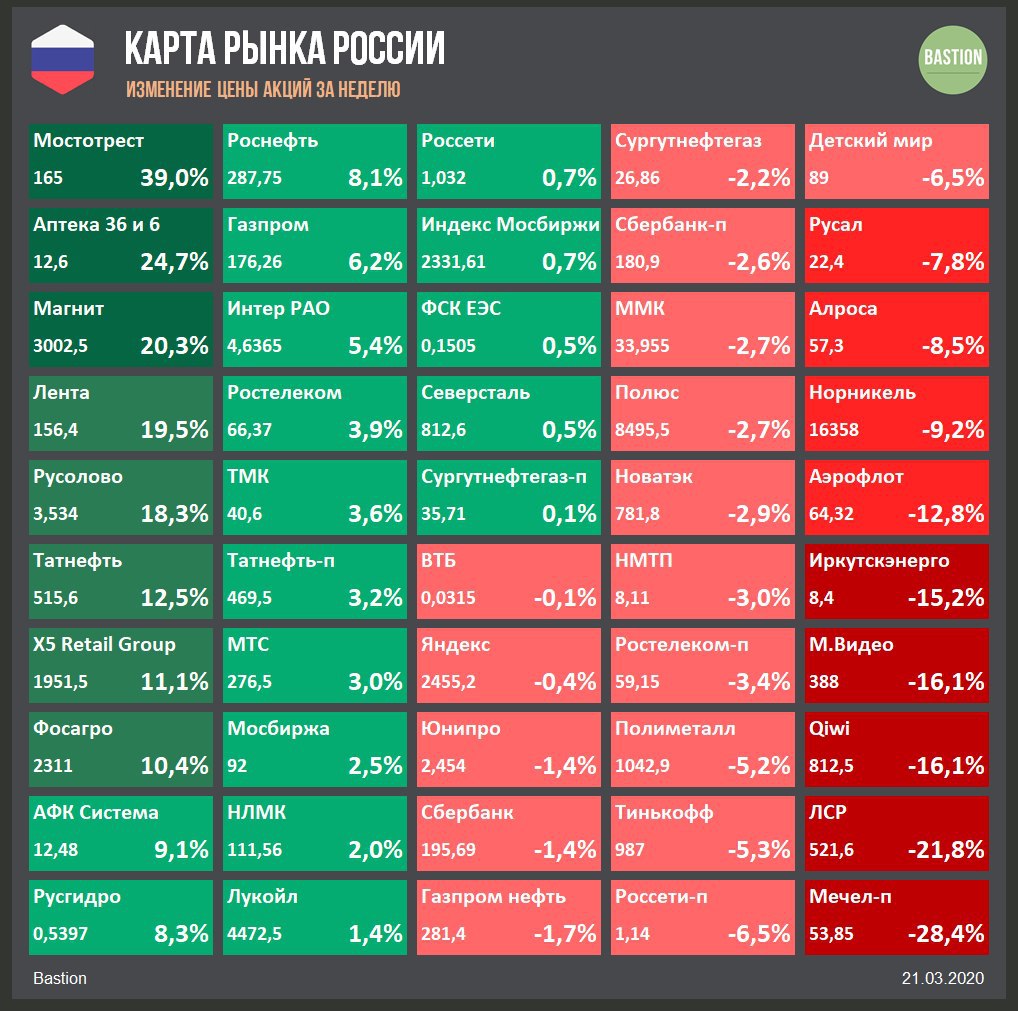 🛢 Нефтегазовый сектор вырос благодаря небольшому восстановлению топливных цен во второй половине недели и снижению курса рубля. В пятницу стоимость нефти марки Brent даже превышала $30. Правда после закрытия российского рынка она вновь опустилась до $27. Татнефть +12,5%, Роснефть +8,1%, Газпром +6,2%.