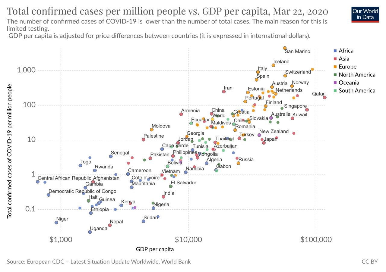Интересный график от Max Roser, означающий, что, возможно, реально зараженных в бедных странах гораздо больше.