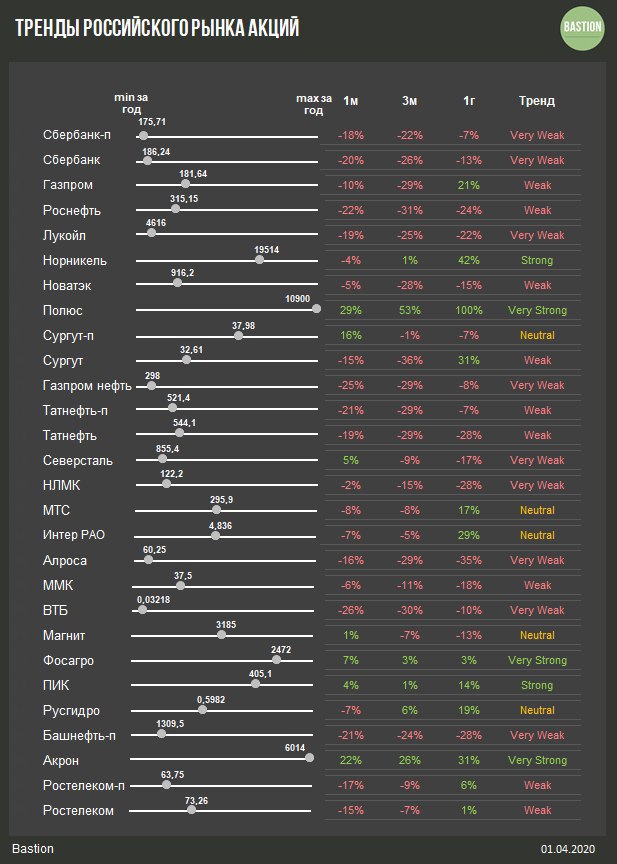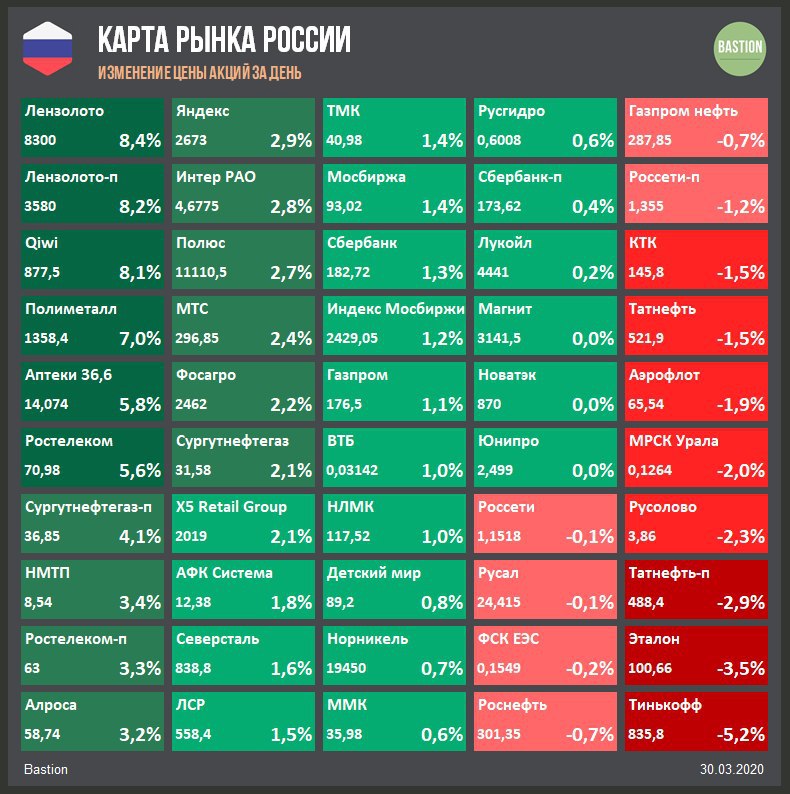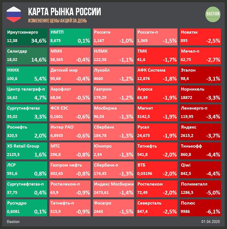 🛢Нефть Brent -11% до $22 за баррель. Цены топливного рынка продолжают медленное сползание из-за ожидания падения мирового потребления в апреле на 15-25%. Несмотря на это, акции нефтегазового сектора пребывают в удивительном спокойствии: Лукойл +0,2%, Газпром +1,1%, Татнефть -1,5%.