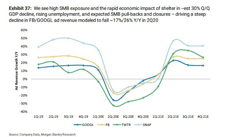 Morgan Stanley прогнозирует, что рекламная выручка Snapchat, Facebook, Google и Twitter во втором квартале снизится на 15-35% в годовом выражении. Некоторые аналитики рекламируют акции Яндекса, бизнес которого в условиях карантина якобы не пострадает. Безусловно, это не так.