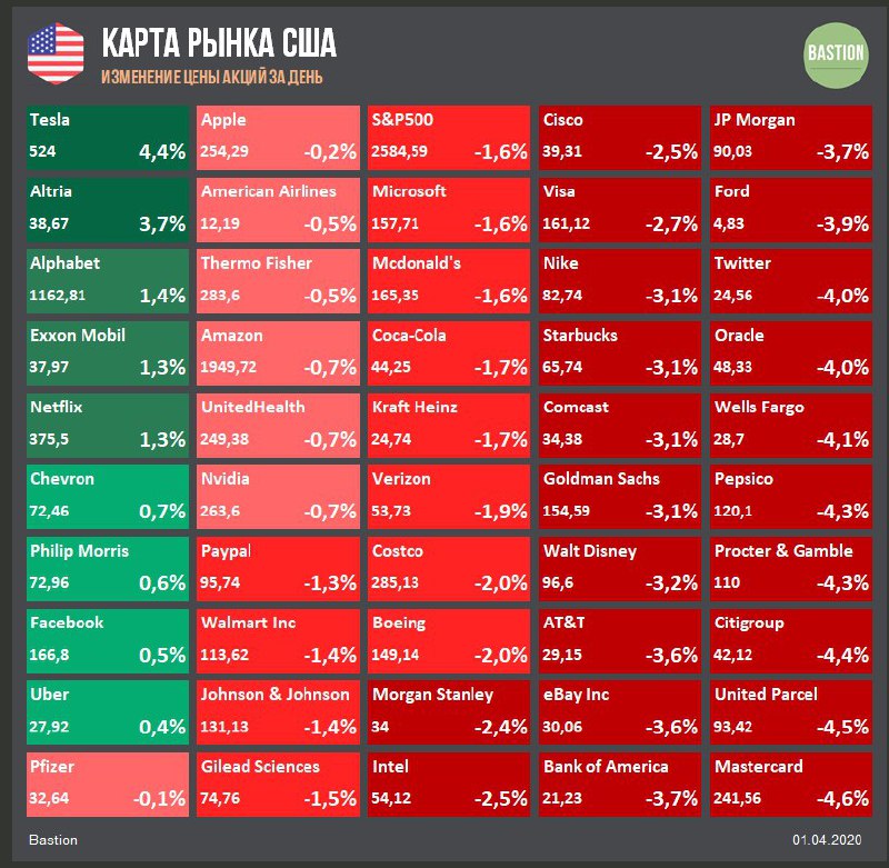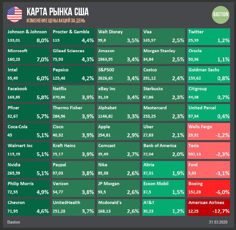 📉Американский рынок закончил первый квартал самым сильным падением с 2008 года. Индекс S&P500 потерял 20%. Среди отраслевых индексов худшим оказался нефтегазовый сектор -51%, лучшим - технологический -12%. Вчера индекс S&P500 -1,5%.