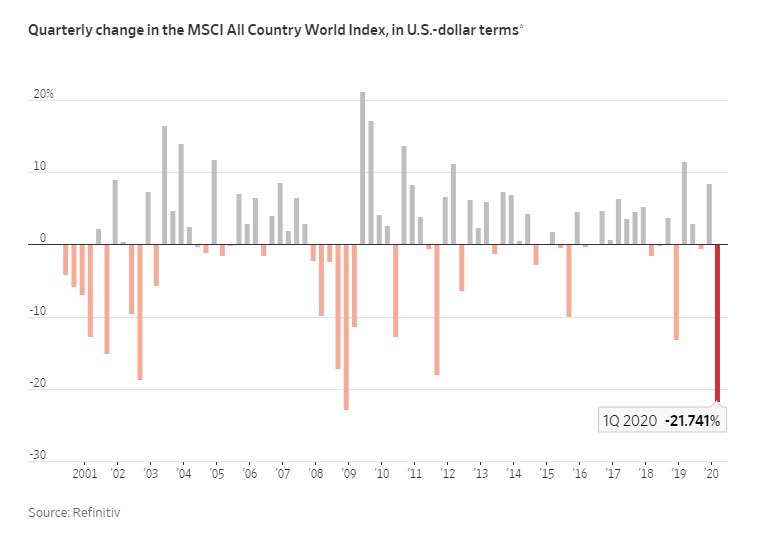 🔹 Индекс мирового рынка акций за 1 квартал 2020 года упал на 21,8%. Если вы начали инвестировать недавно, это может показаться невероятно большим падением, однако в кризис 2007-2009 годов снижение не только достигало 22,8% за квартал, но и длилось 6 кварталов подряд.