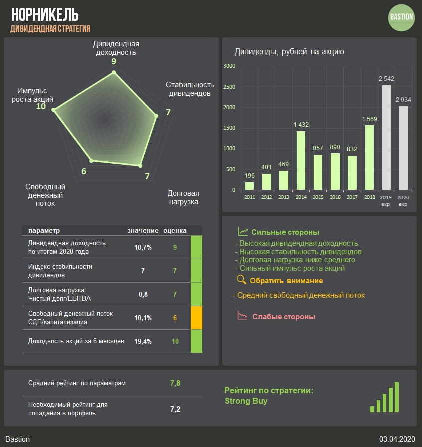 🔹7 апреля совет директоров Норникеля будет обсуждать размер дивидендов по итогам прошлого года. Дивидендная политика Норникеля предполагает выплату 60% от EBITDA, если долговая нагрузка ниже 1,8х. Мы ждем финальной рекомендации в размере около ₽1000 рублей на акцию. С промежуточными выплатами это означает совокупные дивиденды за 2019 год в ₽2542 руб, 13,4% к текущей цене.