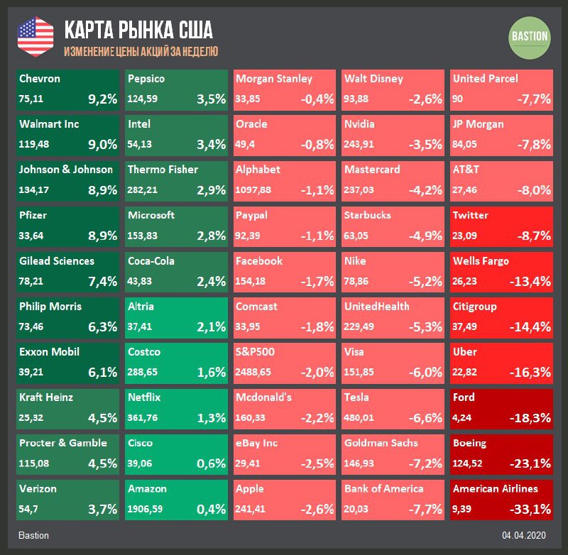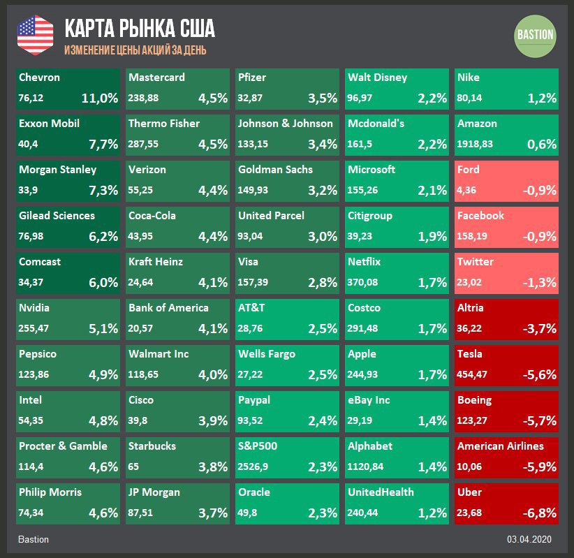 🛢Chevron +11%, Exxon Mobil +7,7%. Нефтегазовый сектор лучше рынка за счет скачка цен на нефть более чем на 20% после комментариев Трампа в Twitter о сокращении добычи в Саудовской Аравии и России. Вчера стоимость барреля Brent доходила до $36, однако в пятницу утром вновь упала ниже $30.