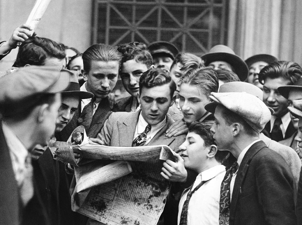 Когда не было мессенджеров и приложений по торговле. "Миллениалы" своего времени следят за котировками во время обвала фондового рынка. 24 октября 1929 года.