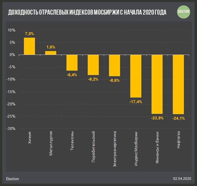 🧪Химия +7%. Сектор - главный бенифициар от снижения курса рубля. Фосагро и Акрон имеют долю экспорта в продажах на уровне 80%, при этом падение спроса на удобрения на фоне мировой эпидемии прогнозируется на минимальном уровне. Некоторые виды удобрений даже прибавили в стоимости за последние 2 месяца.