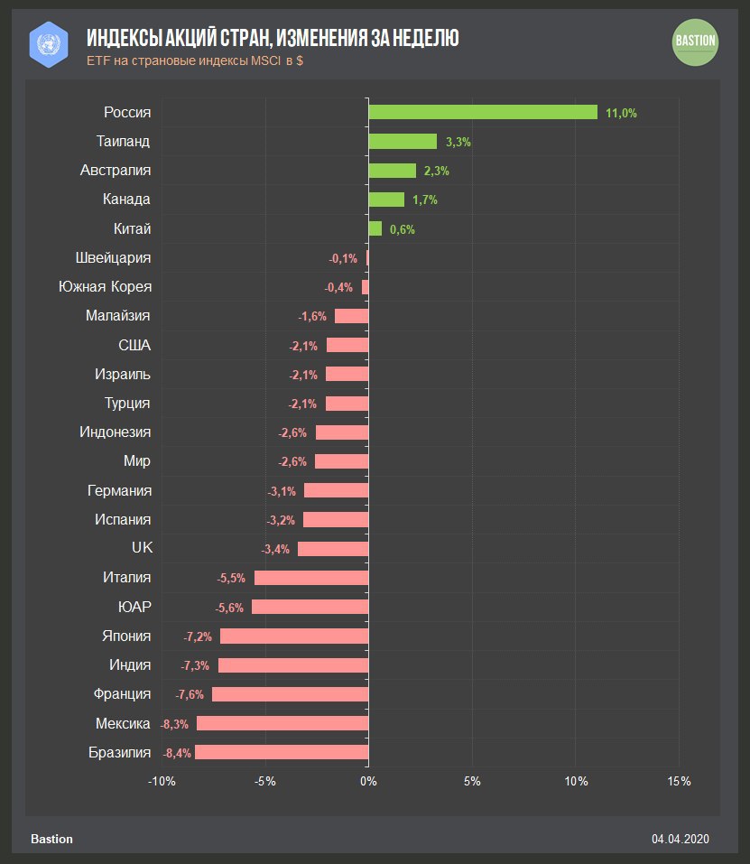 🇷🇺 Россия +11% показывает лучшую доходность благодаря скачку цен на нефть. Рынок ждет совещания ОПЕК+ по сокращению добычи в понедельник. Возможно, что к сделке в том или ином виде присоединятся даже американские компании.