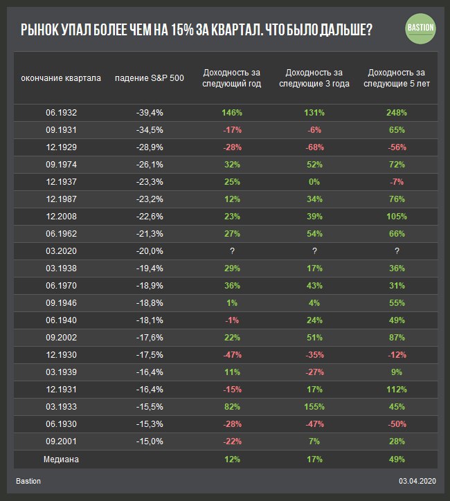 ▫️Первый квартал 2020 года стал девятым по размеру падения индекса S&P500 в истории с 1926 года.
