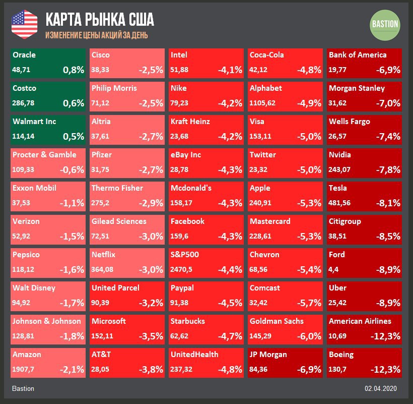 📉S&P500 -4,4%. Белый дом предупредил во вторник, что США могут столкнуться с 240 000 смертей от коронавирусной инфекции, а Трамп попросил американцев подготовиться к кризису в ближайшие дни.