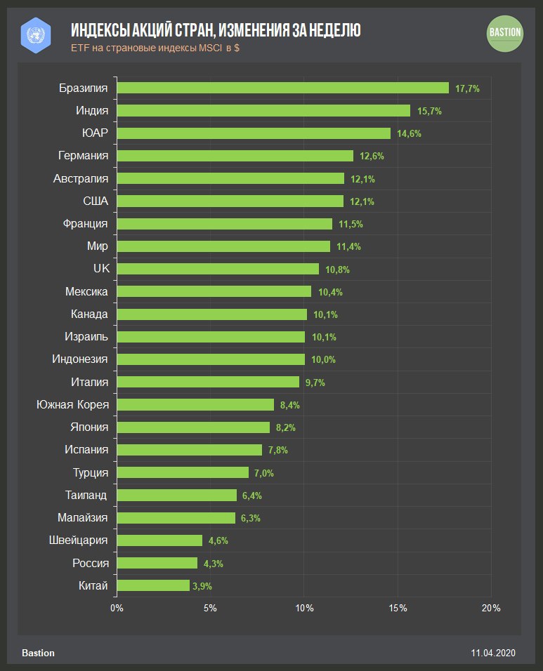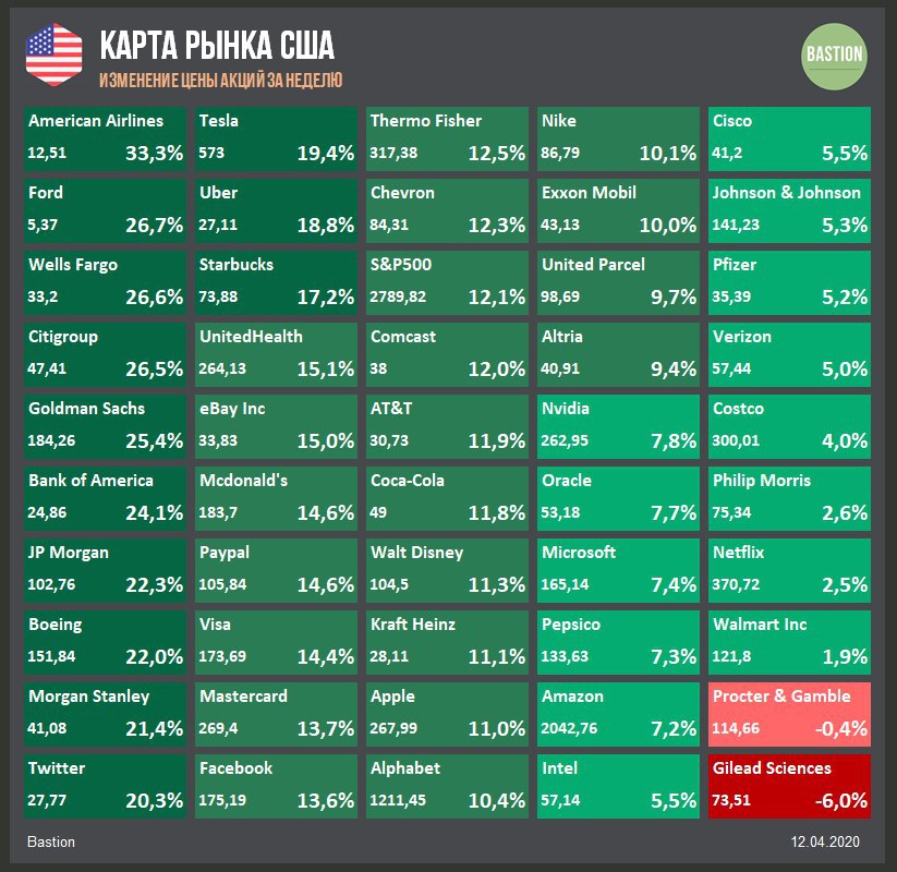 Лучшая неделя для американского рынка за несколько десятилетий благодаря ФРС. Регулятор объявил, что будет скупать мусорные облигации, кредитовать малый и средний бизнес, а также финансировать бюджеты местных штатов. Цена вопроса - $2,3 трлн, более 10% от ВВП США.