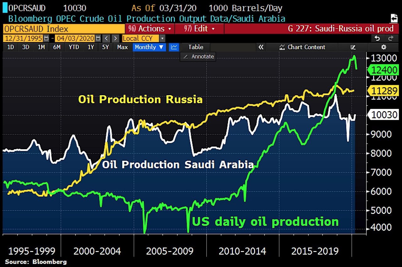 🔹 Даже такого снижения добычи пока не хватит, чтобы стабилизировать рынок. По разным оценкам пик падения спроса на нефть в течение второго квартала может достичь 20-35 млн б/с. Добыча многих стран начнет падать и без каких-либо сделок по ограничению. В ближайшие 2 месяца нефть будет некому продавать и негде хранить.