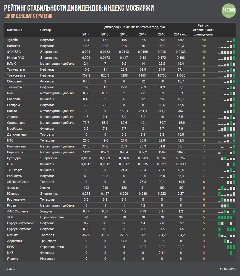 Сумма стабильности выплат и стабильности роста дает итоговый рейтинг, который является частью дивидендной стратегии. Сейчас в расчет включаются ожидаемые выплаты за 2019 год.