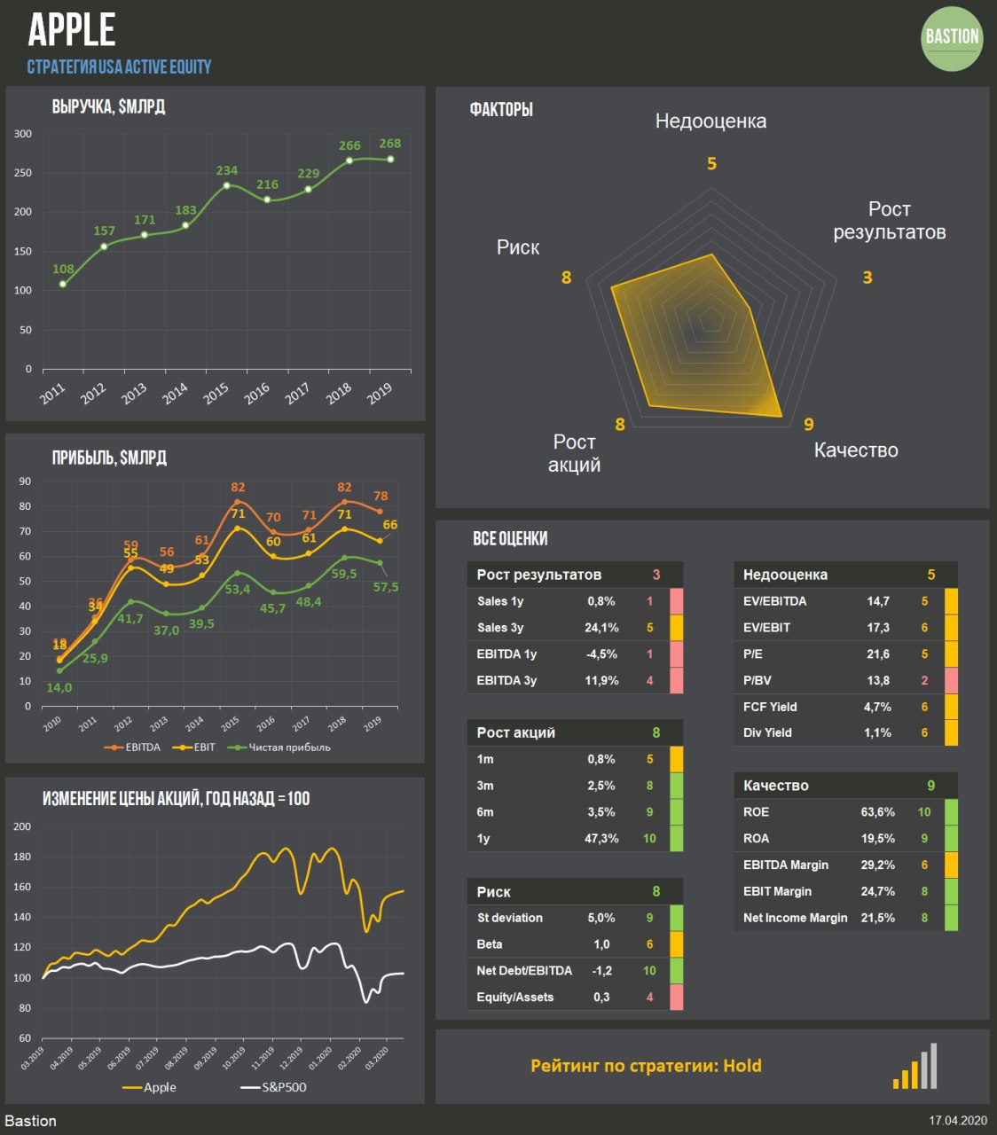 🔹 Рейтинг по активной стратегии Bastion: Hold, не проходит в итоговый портфель. Apple - качественный эффективный актив, который сейчас находится в негативных макроэкономических условиях. Чтобы попасть в портфель компания должна стоить дешевле, либо начать показывать улучшение результатов.