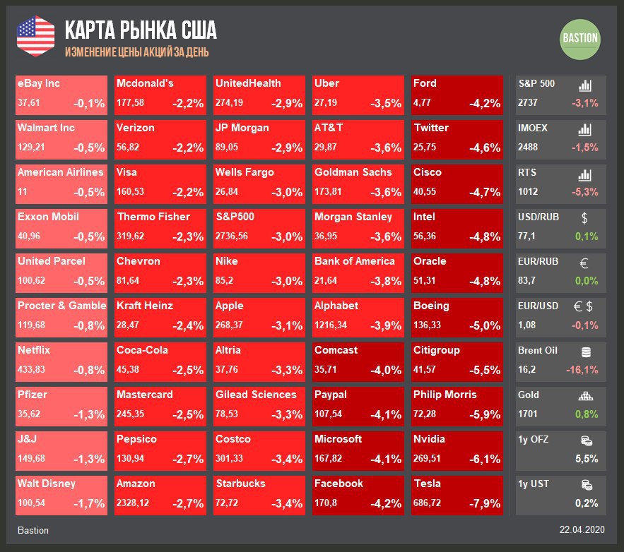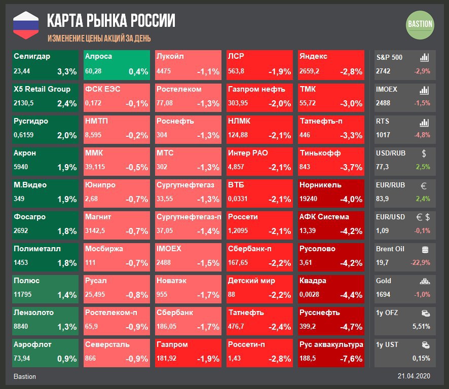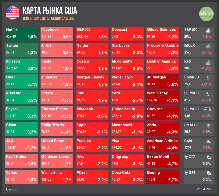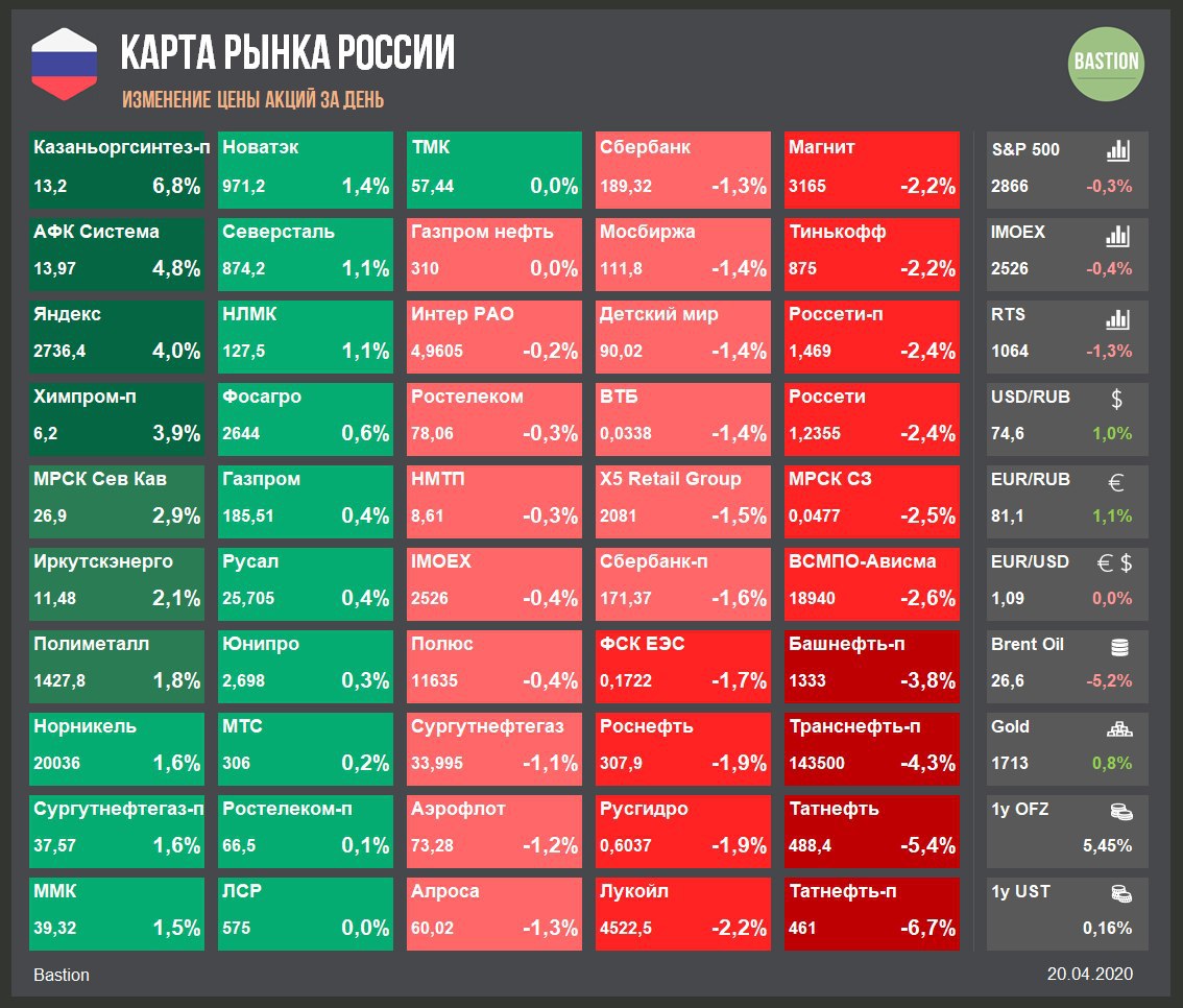 Цена контракта на нефть WTI с поставкой в мае после падения ниже нуля стала объектом внимания общественности. Основной июньский контракт торгуется по $21, вчера он упал всего на 10%. Акции компаний нефтегазового сектора ожидаемо хуже рынка.