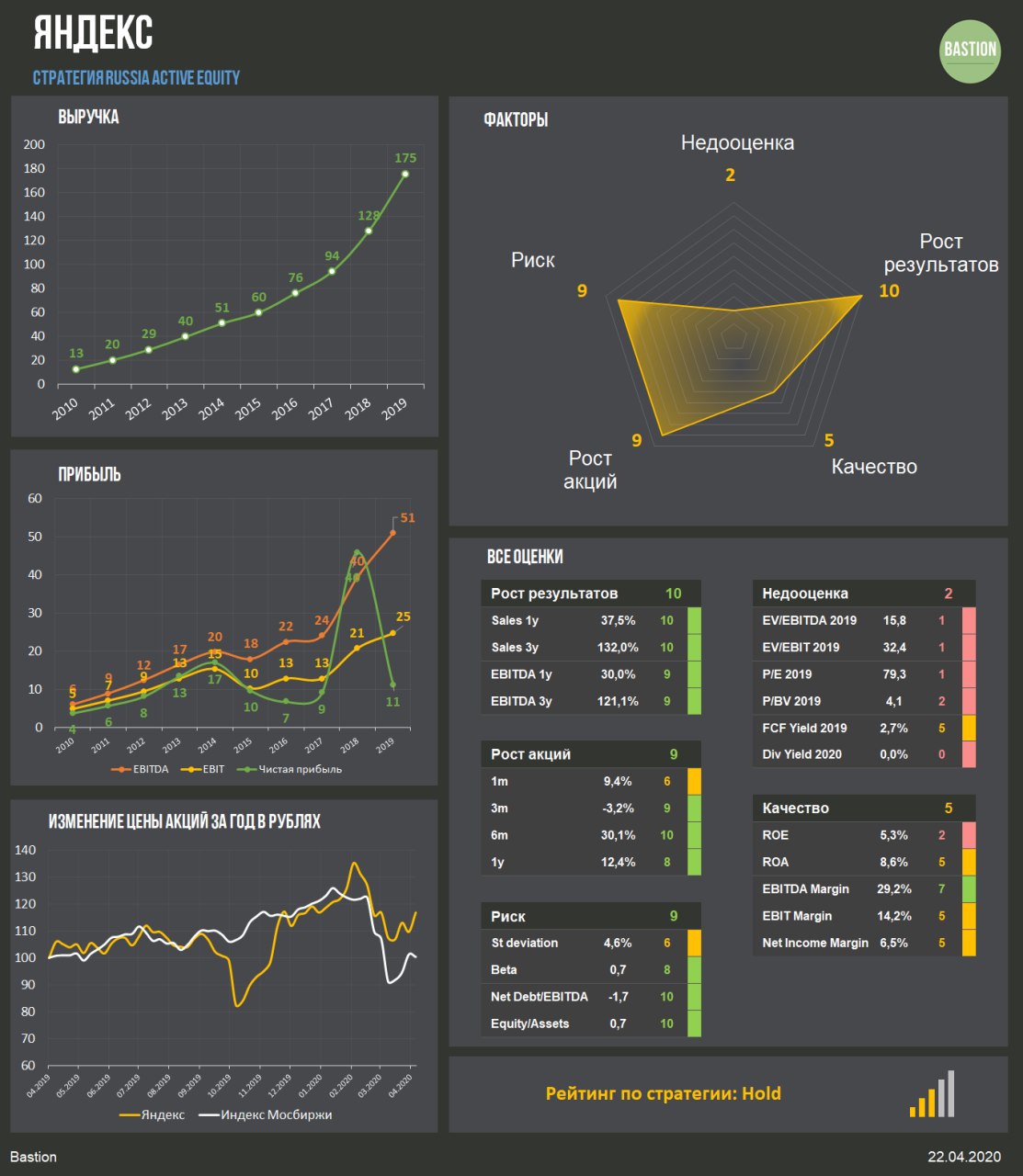 ▫️Яндекс - одна из самых дорогих компаний российского рынка, с оценкой в 16 годовых EBITDA. Высокие мультипликаторы содержат премию за ожидаемый рост бизнеса лучше рынка. Из-за невысоких показателей эффективности общего рейтинга недостаточно для попадания в портфель по активной стратегии.