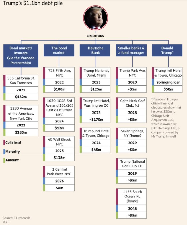Financial Times перед выборами показывает объем обязательств нынешнего президента США. Они заметно ниже оценки активов Трампа от Forbes в $2,5 млрд. Однако большинство кредитов обеспечено недвижимостью, цены на которую падают, что может негативно сказаться на финансовом положении Трампа.