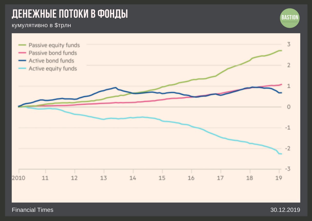 Хотя первые ETF-фонды начали появляться еще в 90-е, их настоящим триумфом стало последнее десятилетие. Низкие комиссии и постоянный рост индексов позволил фондам пассивного управления привлечь $6 трлн средств инвесторов. Индустрия активного управления портфелями акций за это время лишилась более $2 трлн активов.