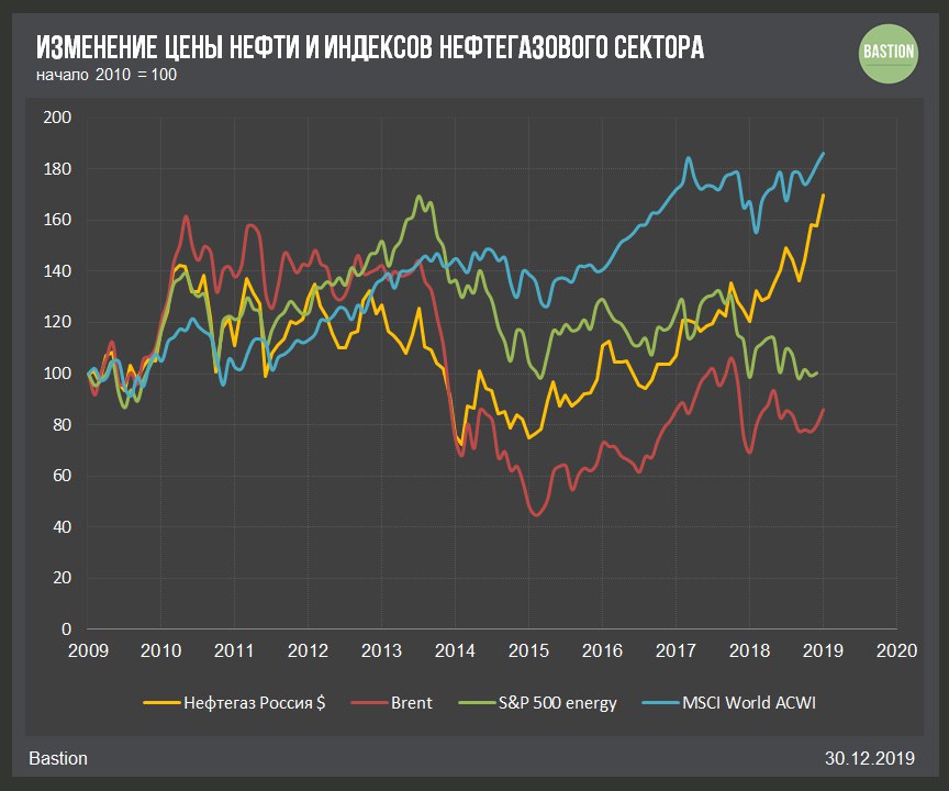 С такими заголовками выходят статьи о состоянии отрасли в США. Несмотря на рост добычи, падение цен на нефть привело к стагнации прибыли и нулевому росту индекса S&P500 Energy. Индекс акций мира MSCI World ACWI за период прибавил более 80%.