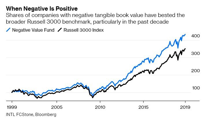 🔹Индекс акций компаний с отрицательной величиной чистых активов заметно опережает индекс акций широкого рынка Russell 3000. Опережение по доходности, скорее всего, объясняется большой долей интернет-сектора.
