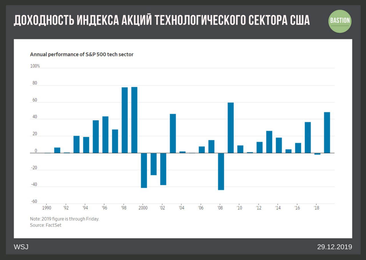 Финансовые СМИ соревнуются как показать суперрезультаты финансовых рынков в 2019 году. WSJ зелеными квадратиками отмечает годы, когда акции США, золото и нефть росли >10%, а синими - когда ставки по 10-летним гособлигациям падали >0,75%.