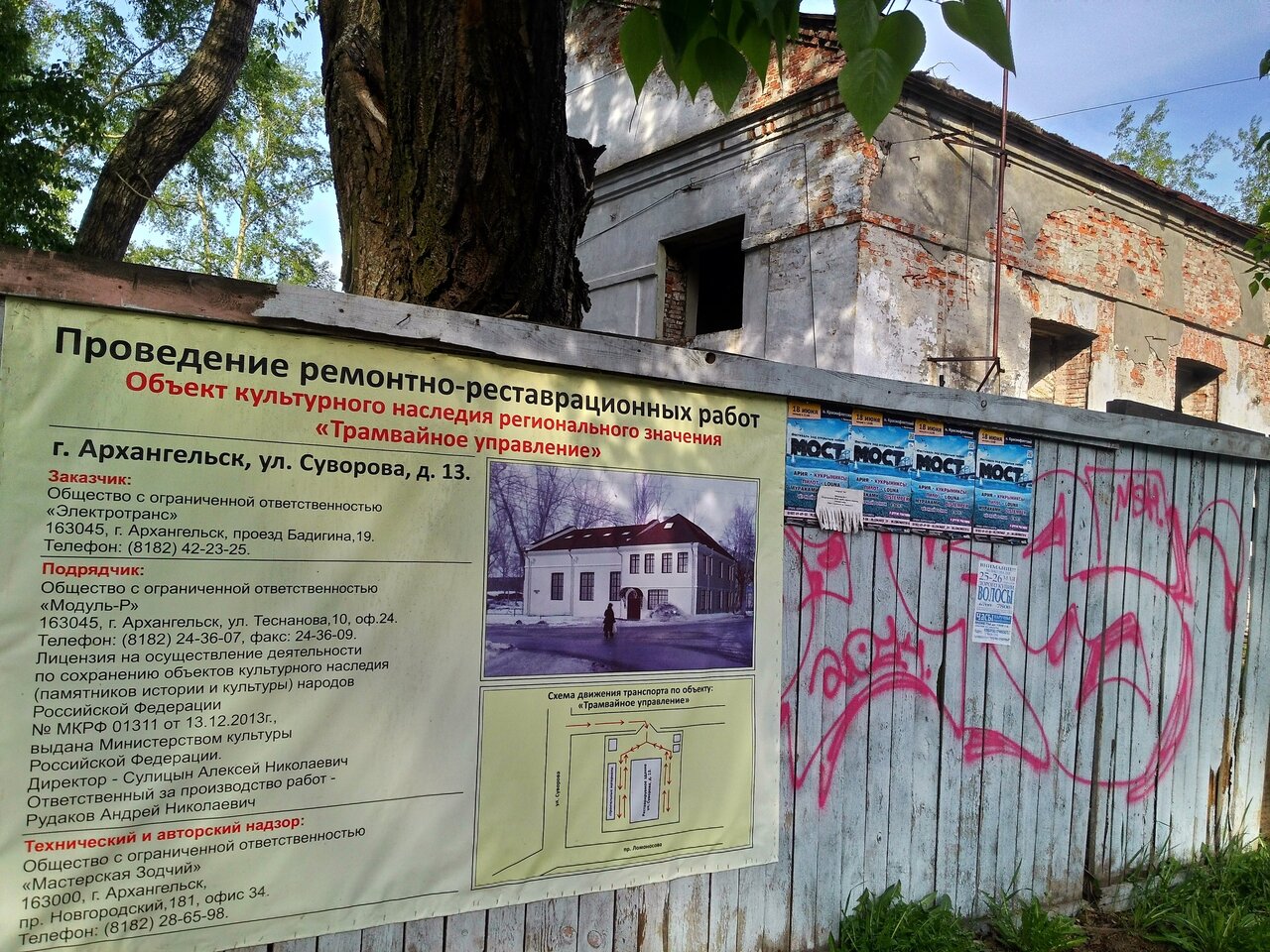 Оказывается, у здания бывшего Трамвайного управления (Суворова, 13) — юбилей. Ровно 10 лет назад, в 2016-м, на него оформили охранное обязательство, предполагавшее реставрацию. И в этом же 2016 повесили аншлаг предполагающий реставрацию. В 2021 году документ обновили, составив новый, очень жёсткий график работ.