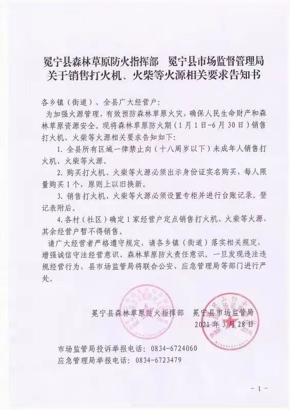 3月28日,冕宁县森林草原防灭火指挥部、冕宁县市场监督管理局联合发布《关于销售打火机、火柴等火源相关要求告知书》,该文件对森林草原防火期(1月1日-6月30日)内销售打火机、火柴等火源提出明确要求: